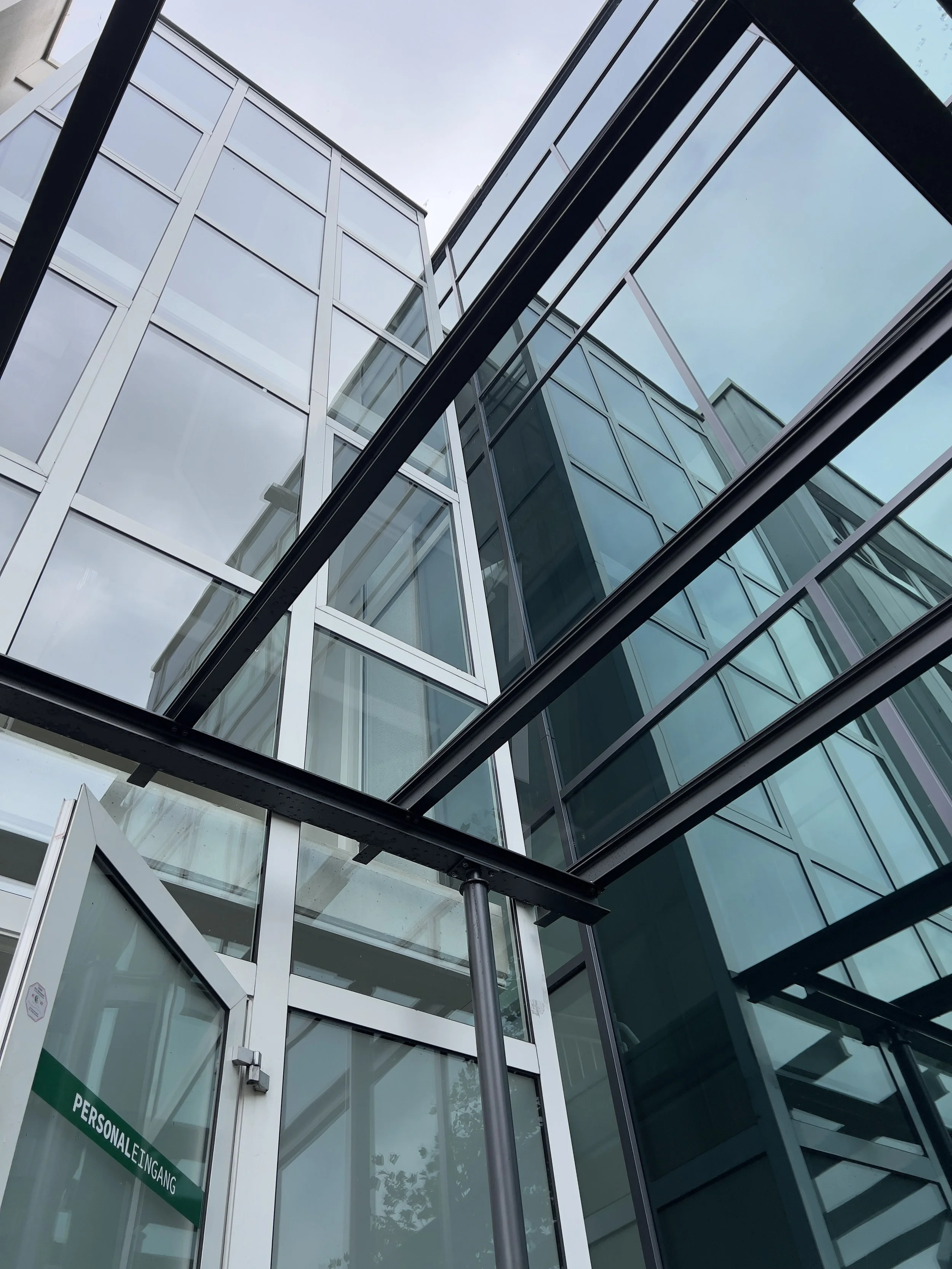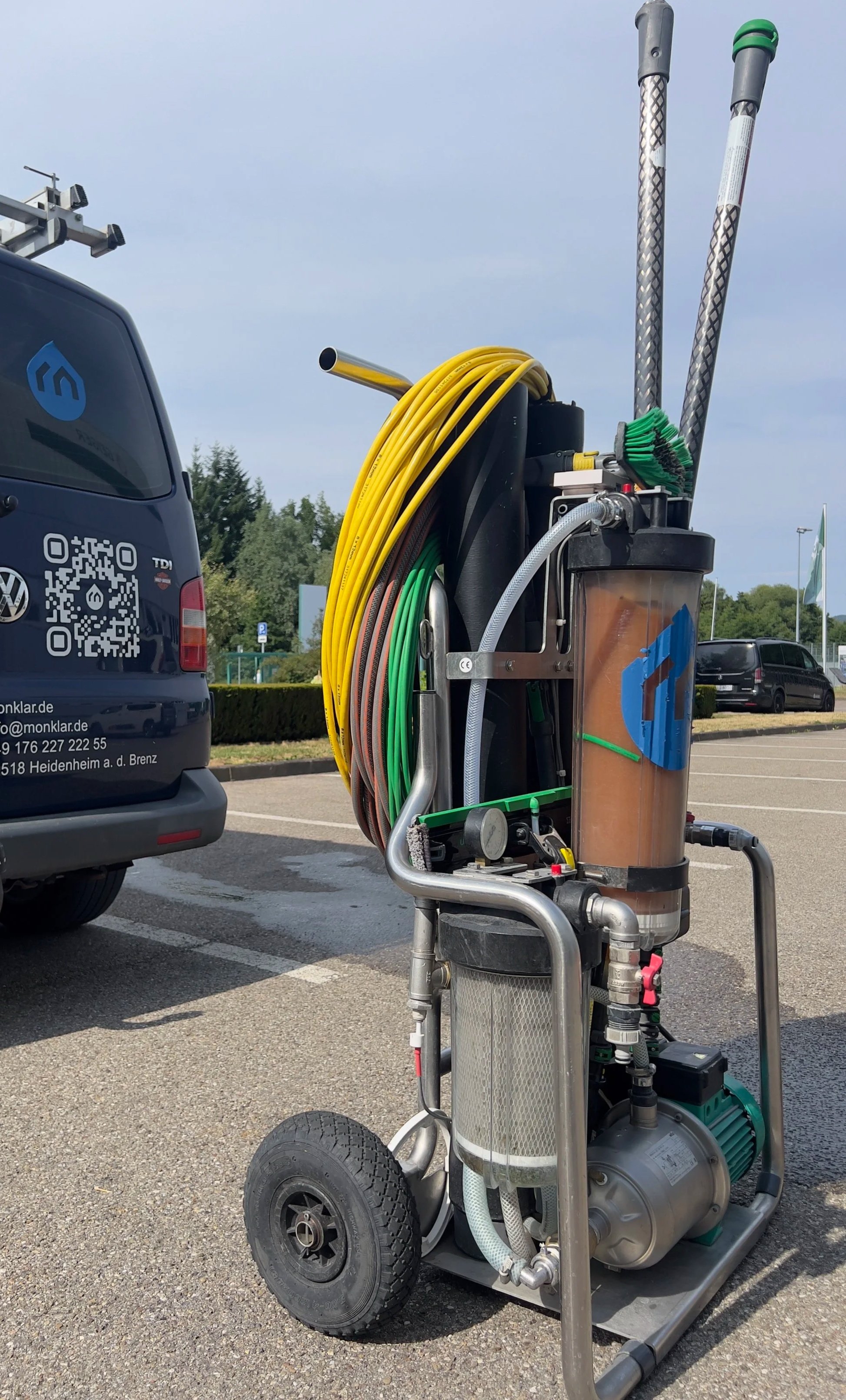 Unsere mobilen Reinwassersysteme und Carbon-Teleskopstangen ermöglichen eine sichere, chemiefreie Glasreinigung bis zu 22 Metern Höhe – direkt vom Boden aus, effizient und umweltbewusst